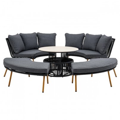 | Размер | Диаметр стола: 95 см. Высота стола: 61/38 см. Высота дивана: 81 см.Ширина дивана: 171 смВысота скамейки: 33 см.Ширина скамейки: 148 см. |